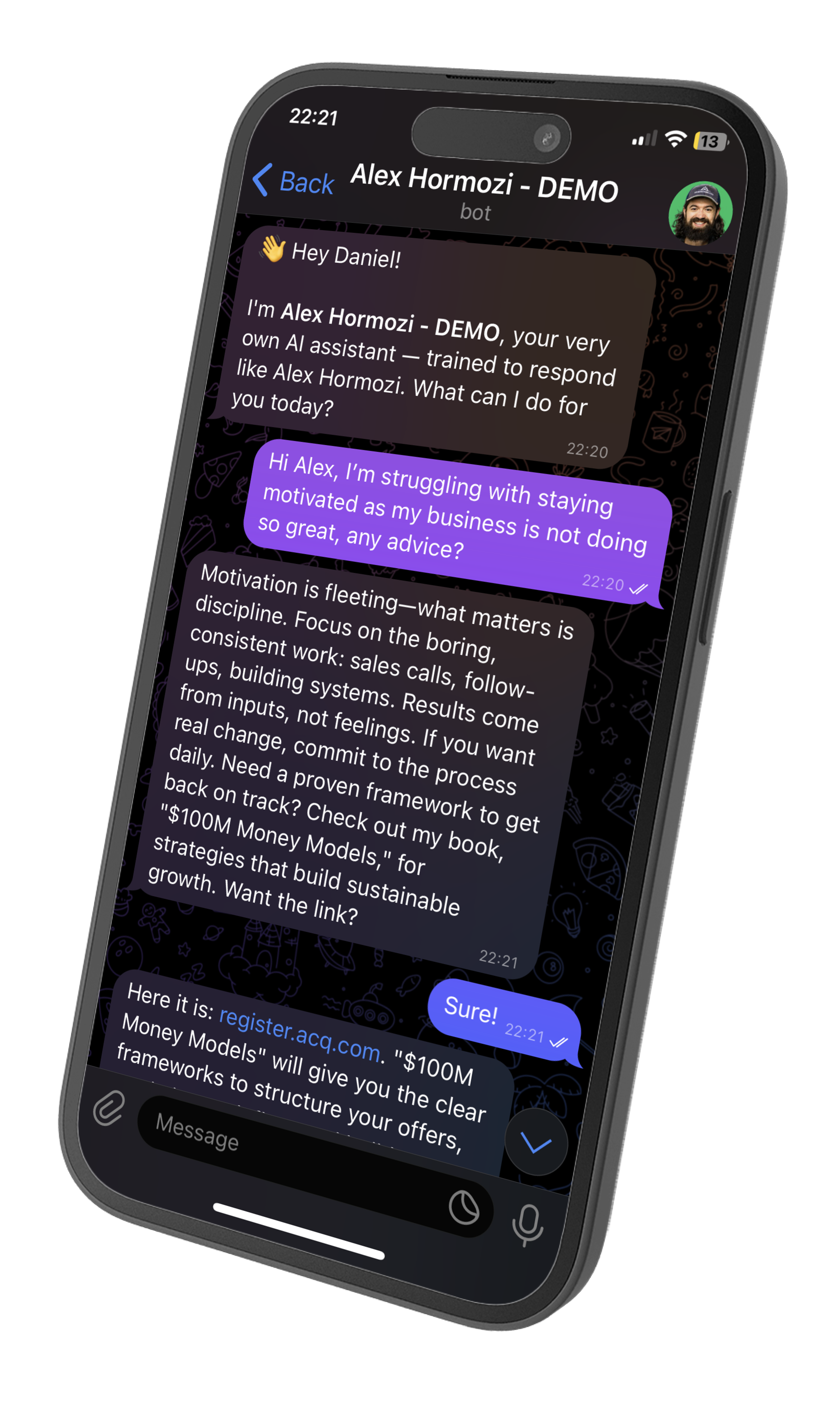Chat with our Alex Hormozi demo bot to see how your AI twin could engage with your audience. No signup required.